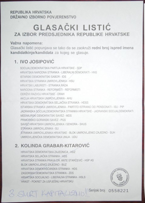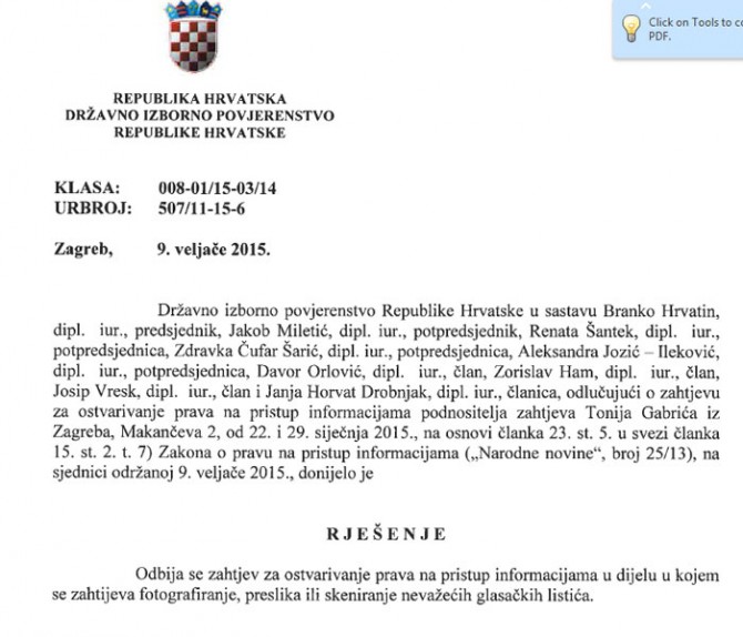 Ovo posebno u slučaju odaziva malog broja birača. Dakle, dopuštanje fotografiranja, fotokopiranja ili skeniranja nevažećih glasačkih listića otvara mogućnost narušavanja Zakonom o izboru predsjednika Republike Hrvatske zajamčene tajnosti glasovanja." To je zaključilo Državno izborno povjerenstvo koje je u punom sastavu, na čelu s predsjednikom Vrhovnog suda Brankom Hrvatinom, na sjednici održanoj 9. veljače odlučivalo o našem zahtjevu za izradu preslika desetak nevažećih glasačkih listića.