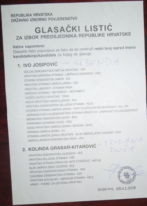 Sljedeća razlika u tumačenjima iskrsnula je oko Adolfa Hitlera, čije su ime neki građani ispisali na listićima, vjerojatno kao poželjni idal-tip budućeg hrvatskog predsjednika. Jest da je Hitler bio fizička osoba, ali upravo je navršeno sedamdeset godina otkako je sebi raznio glavu, i teško da bi tko još mogao nauditi njegovu integritetu. DIP-ove službenice spriječile su fotografiranje njegova imena na glasačkom listiću, a zatim i glasačkih listića s imenima Nikole Tesle i Ante Starčevića – pa bi vjerojatno na isti način postupile i u slučaju drugih davno umrlih pozitivno ili negativno konotiranih povijesnih ličnosti: Napoleona Bonaparte, Marije Terezije, kralja Zvonimira, Aleksandra Makedonskog ili Sokrata, da ih je netko ispisao na listiću…