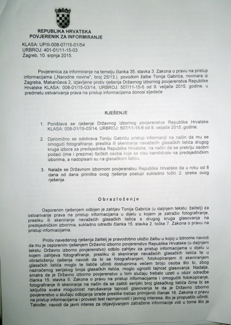 Rješavajući ovaj predmet, povjerenica za informiranje Anamarija Musa u ožujku je osobno posjetila ured Državnog izbornog povjerenstva u Visokoj ulici i pregledala nevažeće glasačke listiće. Istraživanje sadržaja ispisanih rukom od strane glasača dovelo ju je do spoznaje da u tom sadržaju ipak ima elemenata čije bi objavljivanje bilo protivno Zakonu o pravu na pristup informacijama: "Glasači su glasačke listiće poništavali, između ostaloga, i na način da su dopisivali ime i prezime fizičkih osoba koje nisu bile kandidirane na izborima za predsjednika Republike Hrvatske." Te bi osobe, napisala je povjerenica, "trebalo zaštititi". "Otkrivanjem (njihova identiteta) /…/ došlo bi do povrede osobnih podataka neovlaštenim korištenjem od strane trećih osoba u svrhu koja nije podudarna sa svrhom s kojom je tijelo javne vlasti prikupilo osobne podatke, i moguće zloupotrebe tih podataka, te prevladava potreba zaštite osobnih podataka u odnosu na javni interes." Zato je povjerenica naložila DIP-u da se, prilikom fotografiranja nevažećih glasačkih listića, "prekriju osobni podaci (ime i prezime) fizičkih osoba koje se nisu kandidirale na predsjedničkim izborima, a nadopisane su na glasačkom listiću".