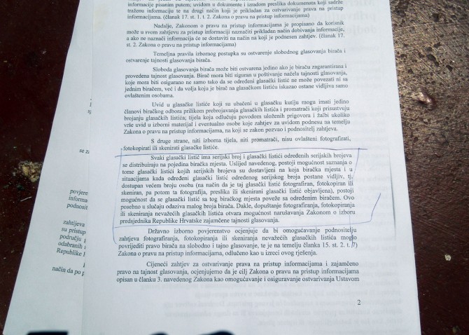 "(U žalbenom postupku) utvrđeno je da sukladno odredbama Zakona o pravu na pristup informacijama ne postoji osnova za zaštitu serijskih brojeva nevažećih glasačkih listića radi povrede tajnosti glasovanja, a s obzirom da se postupajući sukladno propisanoj proceduri glasovanja ne može utvrditi glasački listić kojeg serijskog broja je uručen kojem biraču Naime, (…) DIP je donio Podsjetnik za rad biračkih odbora na izborima za izbor predsjednika Republike u kojem stoji: 'Član biračkog odbora zadužen za uručenje glasačkog listića biračima predaj biraču glasački listić kojeg je prethodno izvukao iz lepezasto postavljenih glasačkih listića okrenutih licem prema dolje (da se ne vidi serijski broj glasačkog listića) i daje usmenu uputu biraču kako slijedi…'"
