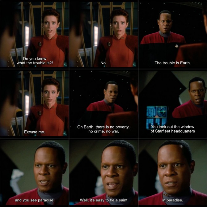 Star Trek je ona iznimno rijetka pojava, uistinu utopistički SF, koji zamišlja društvo bez novca, u kojem su istraživanje i napredak ciljevi sami po sebi. Takva je pretpostavka rijetka između ostaloga i zato što zahtijeva neki vanjski izvor sukoba – u Star Treku su to obično druge civilizacije koje još nisu stigle na tu razinu razvoja. Većina drugih utopijskih vizija obično se s vremenom pokaže kao anti-utopija, savršenstvo s nekim kobnim nedostatkom, ili utopija koja funkcionira kao takva samo za neke – što je, faktično, situacija koju imamo već i danas.