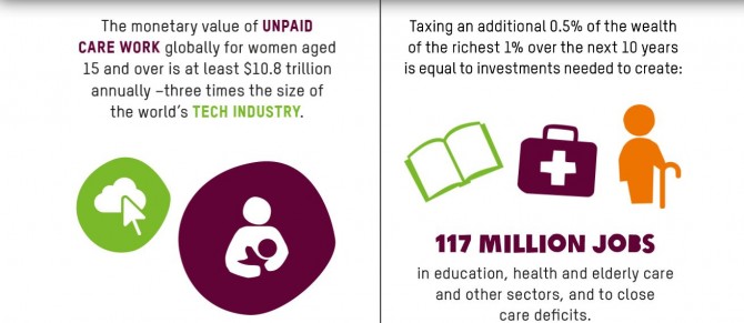 Bogatstvo svjetske elite zgrnuto je na milijardama sati izrabljivanja i neplaćenog njegovateljskog rada, koji uglavnom obavljaju žene i djevojke koje žive u siromaštvu i potječu iz marginaliziranih skupina. Njegovateljski rad presudan je za naše društvo i ekonomiju. Uključuje brigu o djeci, starcima te ljudima s intelektualnim i tjelesnim poteškoćama, kao i svakodnevne kućanske poslove poput čišćenja, pranja, održavanja, odlaska po vodu i osiguravanja drva za ogrjev.