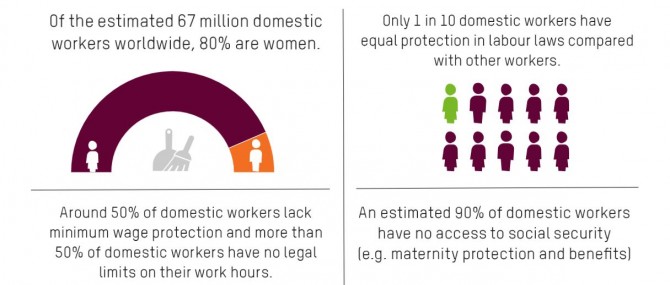 Osim što kućanske poslove obavljaju besplatno, mnoge žene kao kućne pomoćnice rade i za druge obitelji. Posao kućne pomoćnice najčešće nema zakonski ograničeno radno vrijeme niti je zaštićen općim zakonima o radu. Kućne pomoćnice najčešće su izrabljivane i obespravljene, a kad su i plaćene, najčešće ih se smatra pomoćnicama i slugama umjesto zaposlenicama koje imaju određena prava.Oxfamovi znanstvenici izračunali su da ovakav neplaćeni rad ima ekonomsku vrijednost od najmanje 10,8 bilijuna dolara godišnje, što je triput više od doprinosa informatičkog sektora. Širom svijeta žene svoje vrijeme, napor i resurse ulažu u obavljanje svakodnevnih zadataka i pružanje skrbi koju bi u okviru svojih javnih službi trebala osiguravati država