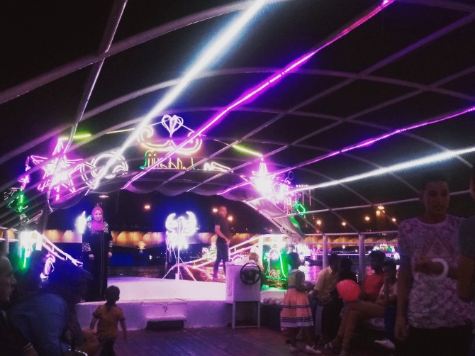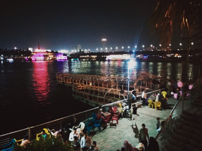 Uz Nil se svaku večer okuplja pola grada, ribari na mostovima, zaljubljeni sramežljivi klinci, parovi s djecom koja u rukama drže svjetlucave balone, šećernu vatu ili sladoled, prodavači kave čije su tegle opasane šarenim tregerima i ukrašene cvijećem, dječaci koji prodaju čaj i Pepsi Čitave obitelji prenose i vuku stvari ukolo, balansiraju šipke na ramenima kao akrobati, a upogonjeni su i konji s karovima na koje trpaju teret. Vari se na ulici, i na plus 40 stupnjeva, a posao traje do dugo u noć, kad se upale šarene lampice koje sve obojaju u toplo veselje. U svakom sirotinjskom naselju u Kairu jedna je stvar zagarantirana – agregati i šarene lampice i trakice(Bebsi), i postavljaju plastične stolice gdje tko na šetnici želi sjesti. Rijekom voze brodovi ukrašeni neonskim svjetlima, trošne feluke. Na svakoj zvučnici i muzika. Ljudi se ukrcaju i za siću prevoze s jedne strane na drugu, a na svakoj vožnji netko spontano započne ples. Djeca se podižu na šipke i vješaju, ljudi plješću, a hrabri plesni inicijatori miču bokovima i šalju poljubce svima.