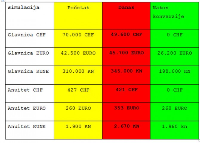 - na temelju hipotetskog izračuna preostale glavnice, da sam imao euro kredit ona bi trebala iznositi 31 200 eura odnosno 235 000 kn, a nakon što se odbije i preplaćeni iznos anuiteta od ukupno 5 000 eura, dolazi se do preostale glavnice od 26 200 eura odnosno 198 000 kn, što je za 43 posto manje od sadašnje preostale glavnice; valja napomenuti da je tečaj CHF-a danas veći za 56 posto od tečaja CHF-a kada sam realizirao kredit;