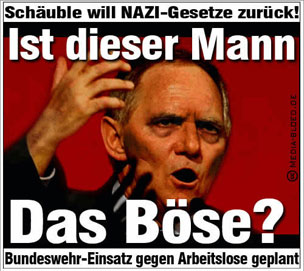 Općenito, ministru je bespravno državno djelovanje uvelike mrsko. On bi najradije promijenio sve moguće zakone, a s njima i ustav, pa da čvrstom rukom pravde lupi po terorističkoj najezdi koja hara svijetom, a posebice u Njemačkoj vreba iza svakog ugla na poštenog, poslušnog građanina. Ako se, recimo, teroristi ipak ne odluče napasti Njemačku, bilo bi zaista šteta pooštrene zakone ostaviti neiskorištene ili ih opet ublažiti. Bolje te zakone iskoristiti, i primijeniti ih na vlastitim građanima. Na kraju krajeva građanska prava, nakon provedbe Schäubleovih prijedloga, ionako više ne bi vrijedila.