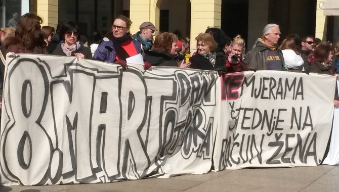 "Okupile smo se ovdje s jednim ciljem, a to je da napravimo mali podsjetnik da je riječ o revolucionarnom prazniku, koji je vezan za ženska prava i radništvo. Htjele smo ukazati na zaboravljenu činjenicu da mjere štednje pogađaju žene drugačije nego muškarce", izjavila je Rada Borić iz Centra za ženske studije.
