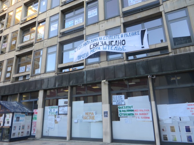 Filozofski fakultet u Beogradu jedini je ostao u blokadi, jer je rukovodstvo fakulteta odbilo prihvatiti njihove zahtjeve i sve do prije nekoliko dana razgovarati s njima. Sada ističu da su ispunili većinu zahtjeva, ali ne i one glavne. Uprava, uz to, blokadu smatra nedemokratskom i nelegalnom okupacijom šačice prosvjednika"Bila je to reakcija na novo povećanje troškova studiranja, koji su pak nastali kao izravan rezultat mjera štednje u Srbiji. Država reže, a onda fakulteti prebijaju razliku na studentima. Drastično se smanjuju plaće dok se povećavaju troškovi studiranja. Ovaj puta smo odlučili reći: dosta je bilo“, kazao nam je Rade, student Filozofskog fakulteta, kojeg smo prošli tjedan zatekli kako zajedno s kolegama dežura na ulazu u ovu instituciju. Studenti zgradu čuvaju 24 sata dnevno, sedam dana u tjednu. I tako zadnjih sedam tjedana. "Raspoređeni smo u tri smjene. Uvijek je netko prisutan, a nekad se zna dogoditi da pojedinci tu budu i do 40 sati. Tako će biti sve dok uprava ne ispuni naše zahtjeve", kazao nam je Rade, koji se, kao i ostali naši sugovornici iz blokade, odbio fotografirati ili reći prezime. "Govorimo isključivo ono što prethodno dogovorimo kao kolektiv. Tako i istupamo pred javnost“, dodaje.