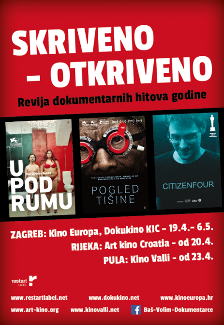 Revija dokumentarnih hitova Skriveno–otkriveno počinje u Zagrebu 19. travnja, a filmove ćete moći pogledati u kinu Europa i Dokukinu s mogućnosti kupnje posebnih paketa ulaznica za sva tri filma. Nakon Zagreba, filmove će vidjeti publika u 30-tak hrvatskih gradova. Detaljne najave projekcija pratite na stranici restartlabel.net i na Facebook stranici Baš volim dokumentarce!
