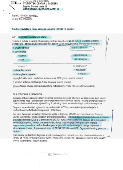 Zanimljivo je uzeti samo jedan primjer, koji možemo potkrijepiti dokumentacijom. Radi se o Odluci o sprječavanju potencijalnih gubitaka nastalih poslovanjem SC- a u Zagrebu, koju je donio tadašnji ministar Mornar, iz listopada 2015. godine. Njome je 15 milijuna kuna uplaćeno SC-u "u cilju sprječavanja budućih potencijalnih gubitaka nastalih provodđenjem projekta rekonstrukcije studentskih naselja Stjepan Radić i Cvjetno naselje". Obrazloženje je da se sanacija provodi između ostalog i ocjenom budućih potencijalnih gubitaka nastalih poslovanjem SC-a . Izvješće o alokaciji sredstava u najmanju je ruku manjkavo.