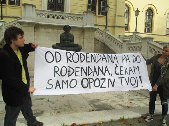 ''Ovo je simbolička proslava 65. rođendana rektora jer on po zakonu i statutu nakon 65. godine mora dobiti produženje ugovora na Filozofskom fakultetu kao redovni profesor. On na FFZG-u ne može dobiti produženje mandata jer je napravio toliko kaosa na sveučilištu da bi to bila sramota. Pod njegovom upravom ne funkcionira pola sastavnica sveučilišta – na FFZG-u ne funkcionira fakultetsko vijeće, na TTF-u ima posla za Uskok, na Hrvatskim studijima je nametnut voditelj, PMF-u je ukinuta subvencija za STEM. Na FFZG-u ne funkcionira fakultetsko vijeće, a time ni statut. Sigurno nastavljamo borbu dok se ne počne poštovati zakon i statut'', rekao je student FFZG-a Emirat Asipi .