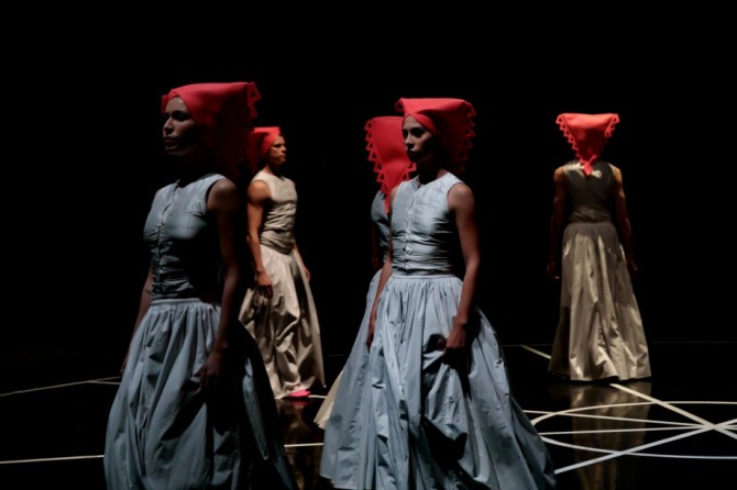 Scenografija je minimalistička i sugestivna; čini ju tek pozadinska uzdignuta posuda iz koje polako sipi sol (ili vise níti konca?). Kostimi su također minimalistički – jednostavnih krojeva i uglavnom svijetlih boja, ali samo djelomično uspjeli – u detaljima ili komadima koji nenametljivo asociraju na narodne nošnje; drugdje su naprosto prozaični, sastojeći se od jednostavnih majica i hlača, ili opet ekscentrični, sastojeći se od različitih fluorescentno rozih komada kao neadekvatnog pokušaja osuvremenjivanja baštine.