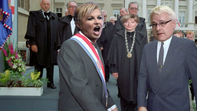 Koliko je Bijedna Naša važna svojim susjedima i "partnerima" u inozemstvu, moći će se procijeniti po broju i strukturi stranih gostiju na predsjedničkoj inauguraciji. Ako joj padne na um, moći će to usporediti s istim Tuđmanovim igrokazima "tako mu bog pomogao" na mjestu užarene krunidbe (1573.) buntovnog seljaka Matije Gupca. Možda će najugledniji diplomatski svijet čoporativno nagrnuti pred crkvu sv. Marka samo da vidi i osjeti naftalinom namirisanu Tuđmanovu lentu preko važnog hrvatskog poprsja, počasnu gardu u odorama iz kazališne krojačnice i državnu Milanović je svima dao znati kako će se odnositi prema predsjednici Republike u ostatku svog premijerskog mandatasimboliku kakvom se ne mogu podičiti ni tisućljetne monarhije.