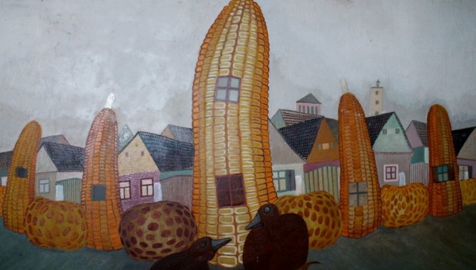 "Ovdje je naslikan muškarac koji muze kozu. Žena je otišla liječiti reumu, zadavši mu da se pobrine za kozu, inače se osuši mlijeko i čeka narednih godinu dana. Koza je bila neposlušna pa su mu susjedi rekli da će pomoći ako se obuče u ženine suknje, što je i učinio. Tri se generacije već šale na račun njegove naivnosti i govore mu da je papučar koji sluša ženu", uvodi nas u dio prošlosti sačuvane na slikarskom platnu. Više ni Kovačica nije onakva kakva je bila na slikama prvih slikara, sudeći po radu jednog slikara, vidljivo je da je tražio osobine nekadašnjih žena u mlađima. Oni su se često bavili onim što ih je tištilo, tumači Babka.
